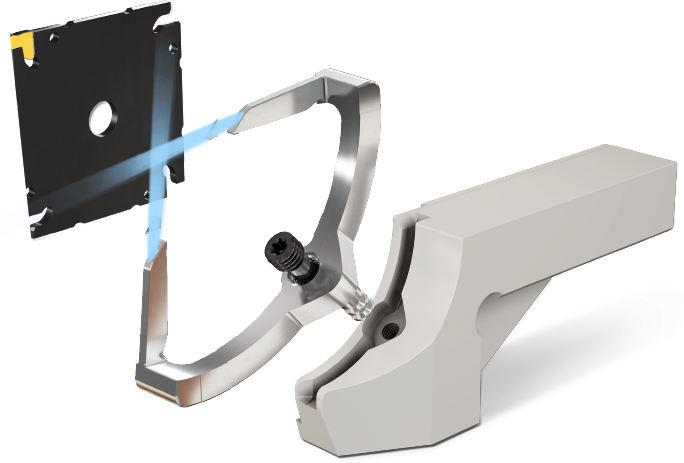 eine einzigartige Methode für die Klemmung eines quadratischen Schneidenträgers mit zielgerichteter, punktgenauer Kühlung. Verbessert die Lebensdauer der WSP.