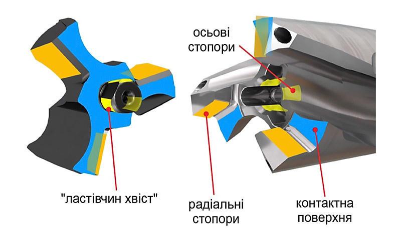 • місце базування інструменту має форму «ластівчин хвіст», яка надійно фіксує та запобігає випаданню голівки з корпусу під час процесу різання.