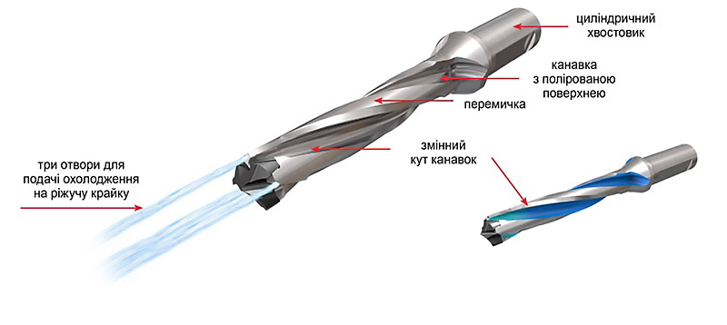 • внутрішні канали забезпечують ефективне охолодження та змащення зони різання в процесі обробки (рис. 6).
